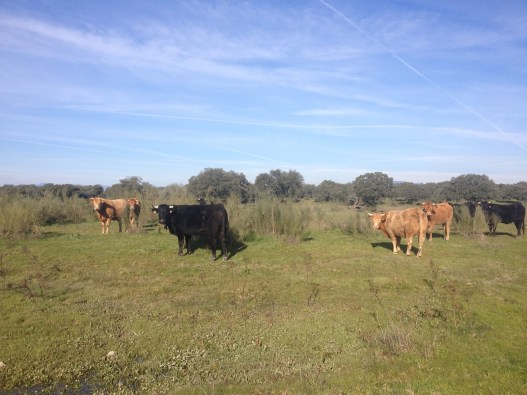 Cáparra, por un pequeño sendero y por grandes pastos entre encinas y mucha cancelita… Infinidad de zonas anegadas han sido lo más difícil de hoy, ya me lo habían advertido peeeero… Por el camino me encuentro 4 niños pequeños con cubos y para los de cai «camaroneras» le pregunto que están cogiendo y me dicen que cangrejos! Cangrejos allí en esos pastos? Le pregunto y me responden con pena que todavía no han cogido nada, que esperan coger morunos por allí? Las ilusiones de los chiquillos! Pues nada una cancela, otra cancela, otra anda mira una puerta !!! No no que es otra cancela y así hasta llegar a una que me lo pienso las vacas marrones no me dan miedo las negras con pinta de toro poco enamorado de la luna si que me causan respeto! Pero nada me armo de valor y me meto bahhhhhhh eran mansas pasaron de mi, al carajo mi heroicidad!