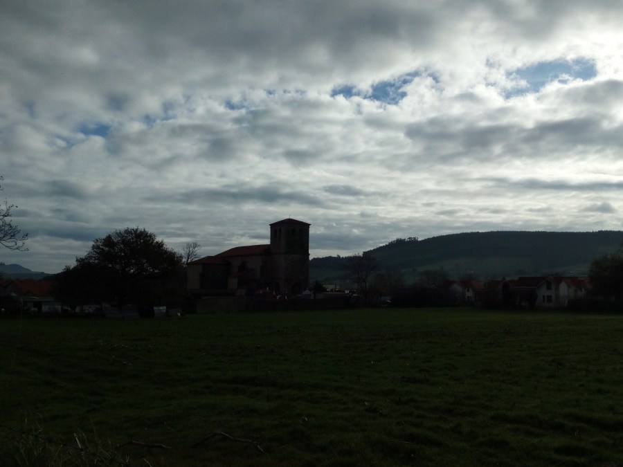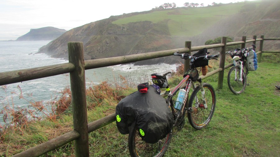 El día se presentó lluvioso. De nuestras alforjas saldrían los recién estrenados equipos de lluvia, ropa plastificada y poco transpirable, que por suerte acabaría abandonada en el fondo de nuestras alforjas el resto de los días. Una mañana que no había comenzado con un «Chirimiri de fina agua» sino más bien, con una buena señora lluvia, que nos auguraba un recorrido amargo bajo una enorme cortina de agua. Cruzábamos los dedos mientras íbamos introduciendo pertenencias en nuestras alforjas. -Vaya comienzo…-comentábamos cabizbajos.- Tranquilo, seguro que «escampa pronto» – Nos tratábamos de autoconvencer…