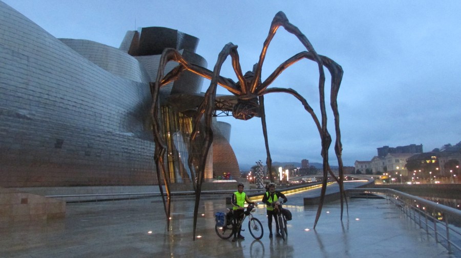 Y así, sin más pena ni gloria, llegamos a Bilbao. En esta ciudad nos esperaba Rafa, un compañero de la red Warmshowers y maestro universitario, que nos brindó su casa para que pudiésemos descansar y disfrutar de Bilbao. Tuvimos la suerte de que Rafa nos mostrara su ciudad, su catedral de nombre Santiago, sus calles o mejor dicho «Kaleas», el Arenal y su ría de Nervión, el museo de Bellas Artes y los rincones de las 7 calles. Para rematar nuestra buena suerte, hemos coincidido con un Bilbao en fiestas,las fiestas de Santo Tomás; un festejo que se remonta a tiempos de caseríos, cuando los inquilinos de los pueblos traían sus productos agrícolas y artesanales a la ciudad como moneda de cambio a sus señores arrendadores. Festividad que en la actualidad se aprovecha para juntarse con cuadrillas de amigos y los más jóvenes para beber txakolis hasta perder el rabillo de las txapelas.