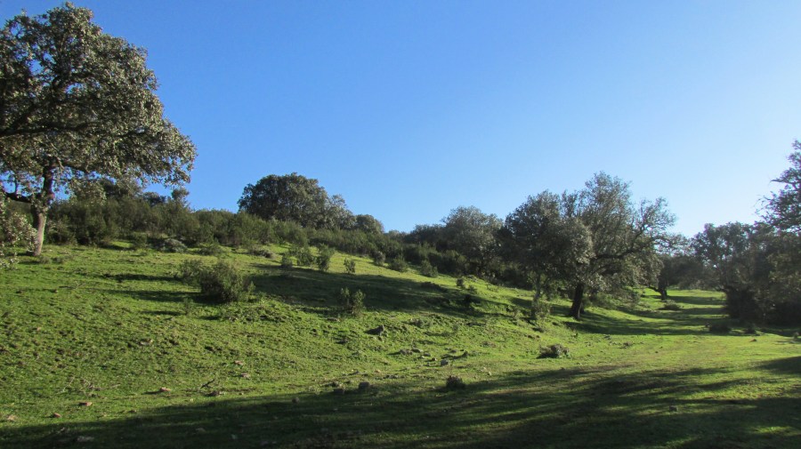 Cáparra, por un pequeño sendero y por grandes pastos entre encinas y mucha cancelita… Infinidad de zonas anegadas han sido lo más difícil de hoy, ya me lo habían advertido peeeero… Por el camino me encuentro 4 niños pequeños con cubos y para los de cai «camaroneras» le pregunto que están cogiendo y me dicen que cangrejos! Cangrejos allí en esos pastos? Le pregunto y me responden con pena que todavía no han cogido nada, que esperan coger morunos por allí? Las ilusiones de los chiquillos! Pues nada una cancela, otra cancela, otra anda mira una puerta !!! No no que es otra cancela y así hasta llegar a una que me lo pienso las vacas marrones no me dan miedo las negras con pinta de toro poco enamorado de la luna si que me causan respeto! Pero nada me armo de valor y me meto bahhhhhhh eran mansas pasaron de mi, al carajo mi heroicidad!