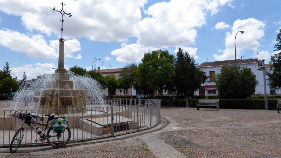 Entro en Villanueva de la Fuente, almuerzo el bocadillo de sardinillas en tomate que me sobró de la noche anterior y descanso en un pequeño banco. Una frenada en un stop y un golpe metálico me hacen girar mi cabeza a la izquierda, con lo que veo que el remolque de un vehículo se había desprendido de su bola. Toca dejar las sardinas a un lado para ayudar al señor, sin que me lo pida, a enganchar el remolque correctamente y conectarle las luces, ya que el señor no atinaba con la conexión, engancho, conecto me voy a la parte trasera, me subo, -no se mueve, levanta el vehículo, todo correcto ahora si que está fijo, puede usted seguir la marcha.